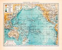 Op deze antieke kaart uit ca. 1900 staat de Grote Oceaan afgebeeld. Er is een legenda met hoogte en dieptegordels opgenomen. De kaart is in kleur.