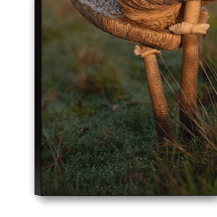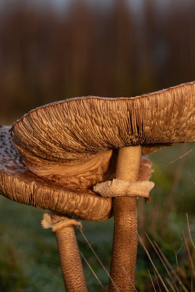 Deze foto is genomen in De Groote Peel in Ospeldijk. Tijdens een vroege najaarswandeling kwam de ochtendzon de prachtige natuur verlichten. Deze Grote Parasolzwammen kleurden prachtig in het met dauw bezaaide gras.