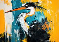 Grote Vogel | Vogel Zwart - Op dit vogels schilderij zie je een grote, gracieuze vogel met een lange snavel, gekleed in zwart en wit, tegen een achtergrond van felle kleuren zoals geel en turquoise, wat het geheel levendig maakt.