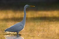 Vissenden Grote Zilverreiger (Ardea alba), staand in het water, met tegenlicht.