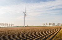 Grote Nederlandse akker met convergerende ruggen kleigrond. De pootaardappelen zijn kortgeleden geplant. Op de achtergrond staat één windturbine. De hemel is blauw gekleurd met wat sluierbewolking.