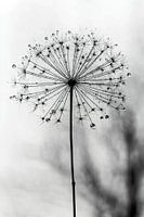 Grote berenklauw in zwart wit. Heracleum mantegazzianum. Echtend dauw op uitgebloeide grote berenklauw.