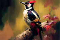 Een statige en mooie grote bonte specht op een tak tegen een onopvallende achtergrond.