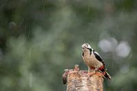 Grote bonte specht in een regenbuitje in Delden, Overijssel