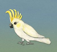 Een aquarel tekening van een schattige grote geelkuifkaketoe. De kaketoe loopt op de grond. Zijn gele kuif staat omhoog.