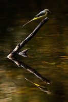 Een grote gele kwikstaart op een uitstekende stok boven het stromende water. De herfstkleuren van de omgeving reflecteert in het water en geeft het een warme gloed.
