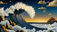 Een imposante golf die de elementen van de oceaan en de lucht verenigt. Tegen de achtergrond van een betoverende nacht met fonkelende sterren rijst de enorme golf op, indrukwekkend krachtig en tegelijkertijd gedetailleerd in zijn structuur. De wolkenformaties geven het landschap een fascinerende diepte en textuur. Een woeste kustlijn…