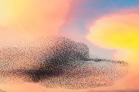 Spreeuwen verzamelen in een kleurrijke lucht tijdens een kalme zonsondergang aan het eind van de dag. Enorme groepen spreeuwen (Sturnidae) in de lucht die bewegen in vormveranderende wolken voor de nacht. De gesynchroniseerde bewegingen van spreeuwen murmuraties creëren betoverende patronen in de lucht, met de vogels die eendrachtig…