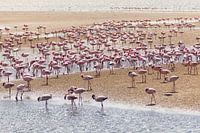 Een grote kolonie roze flamingo's loopt op het strand. In de verte is de zee te zien. Op het strand, dat alleen uit zand bestaat, staan plassen en poelen water. De flamingo's zijn eten aan het zoeken.