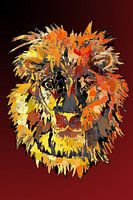 een decoratief kunstwerk van een grote mannetjesleeuw met talrijke geometrische decoratieve elementen in kleuren van geel tot rood. een geweldig ontwerp voor fans van dierentuinen, safari's en grote katten.