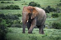 In Addo Elephant National Park zijn honderden olifanten. De eerste dagen dat weer zijn zien we verschillende manntjesolifanten die eenzaam door de vlaktes trekken. Addo heeft mooie heuvels en het atk is groen van de vele regen. Deze grote olifant heeft een net een modderbad gehaald en de bruinrode modder is nog goed te zien op zijn rug en hoofd. Zin slagtanden steken wit af tegen zijn grijze huid.