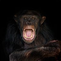 Chimpansee schreeuwt naar de fotograaf en kijkt recht in de lens.