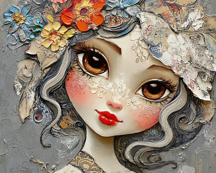 Grote ogen meisje | Dromerig meisje met grote ogen - Op dit vrouwen schilderij zie je een meisje met grote ogen, omringd door kleurrijke bloemen en met een zachte uitstraling op haar gezicht, wat een dromerig gevoel oproept.