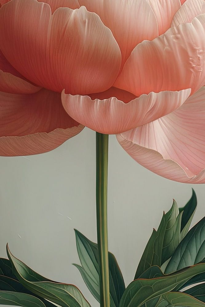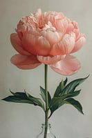 Een artistiek ontworpen poster met een grote pioenroos in een heldere vaas tegen een lichtgekleurde achtergrond.