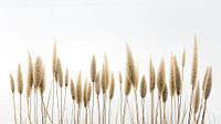 Een panorama natuurprint van beige kleurige rietpluimen tegen een witte, lege achtergrond.