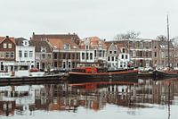 Een grote rode boot ligt in rivier het Spaarne in Haarlem. De huizen op de achtergrond maken het Nederlandse plaatje af. Gefotografeerd door reisfotograaf Sanne Dost.