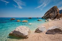 Grote rotsen in het blauwe water van de Middellandse Zee op het zandstrand van Cala Mariolu in de Golfo di Orosei baai op een prachtige zomerdag aan de oostkust van Sardinië, Italië.