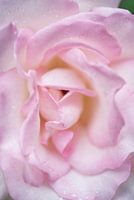 Grote roze roos met regendruppels - een prachtige grote zachtroze roos die open staat na een vroege regenbui. Het frame is gevuld met de open roos met alleen een klein groen vlekje in de rechterbovenhoek.