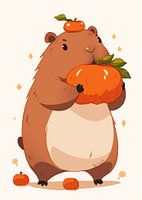 Hij houdt een grote, feloranje, ronde citrusvrucht (waarschijnlijk een sinaasappel) in zijn handen, die ook een lichte, bruinachtige tint hebben. De buik en ledematen van de bosmarmot hebben een lichtere perzikkleur. Het lichaam is glad en rond.