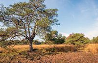 Grove den op de voorgrond van een Nederlands natuurgebied in herfstkleuren. De heide en het gras zijn vergeeld vanwege de aanhoudende droogteperiode. Het is een zonnige dag met een heldere blauwe lucht. De foto is gemaakt op de Strijbeekse Heide, een natuurgebied ten zuiden van Breda op de grens van Noord-Brabant en België.