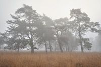 Grove dennen in het gele gras op een mistige ochtend in het Deelerwoud op de Veluwe.