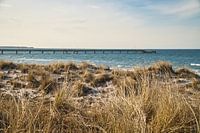 Krib in Zingst aan de Oostzee. Kribben reiken tot in de zee. Landschapsfoto.