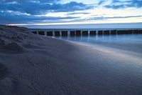 Groyne in Zingst aan de Oostzee. Kribben die in zee reiken. Landschapsfoto. Genomen op het blauwe uur