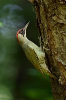 Green Woodpecker / Grünspecht ( Picus viridis ), perched on a tree trunk, clinging, in typical pose, wildlife, Europe.
