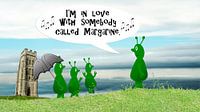 Cartoon animation. Grüntyers on tour performing one of their hit numbers at Glastonbury.