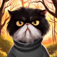 Grumpy kijkende zwart witte Perzische kat met een trui aan in een herfstbos
