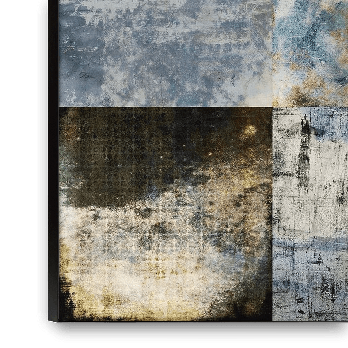 In deze rustieke, geometrische compositie vormen negen verschillende getextureerde vierkanten een raster van 3x3, elk met een verschillende mate van slijtage, kleur en verwering. De suggestieve kleuren variëren van diepblauw tot aards bruin en gedempt groen, waarbij elk vierkant een unieke patina vertoont die duidt op ouderdom of…
