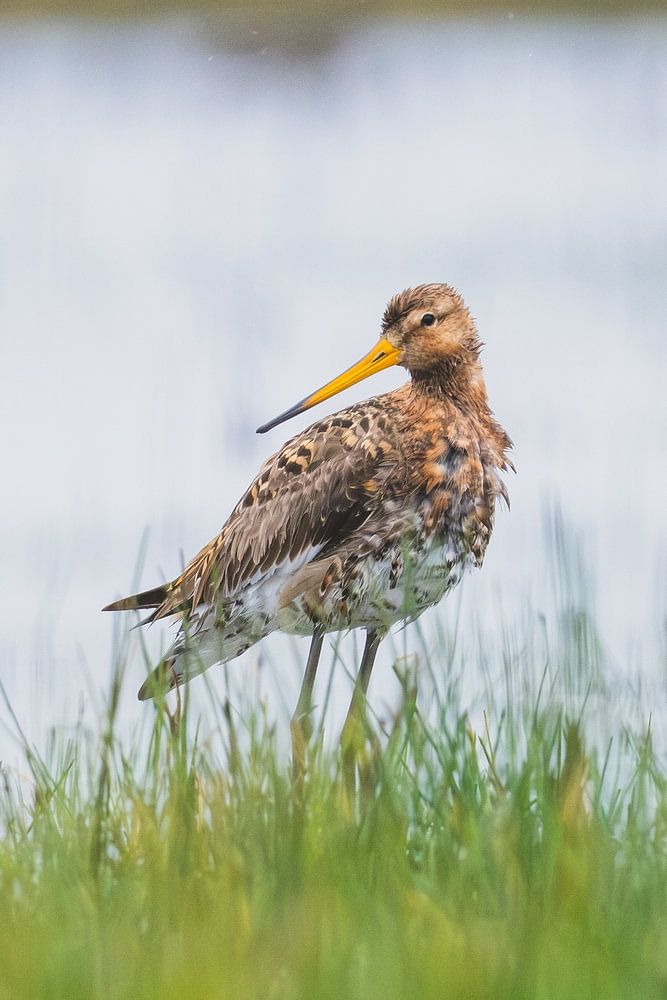 Deze foto toont een elegante steltloper — namelijk de grutto — die alleen staat in een grasrijk gebied vlak bij het water. Zijn lange, licht gele snavel en gevlekte bruin-witte verenkleed vallen mooi op tegen de zachte, onscherpe achtergrond. De vogel staat alert en rustig, alsof hij het landschap observeert. De setting ademt de stilte van een natte weide, een plek waar natuur en rust samenkomen.