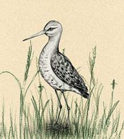 Een tekening op karton in zwart kleurpotlood van een grutto. De weidevogel staat in het gras. Het gras is donkergroen. De kleur karton van de vogel is lichter dan de achtergrond, zodat de grutto mooi loskomt.