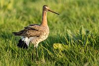Een grutto poseert in een weiland en schudt nog eens de staartveren op. De grutto hoort bij de steltlopers. De vogel kijkt eens om zich heen, lopend door het gras.