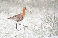 Grutto (limosa limosa) tijdens een sneeuwbui in een weiland in Friesland