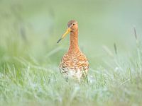 Toen ik deze grutto fotografeerde had het net iets gesneeuwd wat het gras een mooie wit effect gaf. Toen deze grutto steeds dichter bij kwam en op een gegeven moment keek wat ik aan het doen was met mijn buik in het natte gras...kon ik deze plaat maken.
