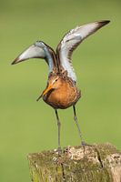 De Grutto, de nationale vogel van Nederland gefotografeerd op een paaltje in een weiland.