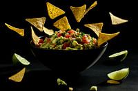 Een spannende compositie van verse guacamole, felrode tomaten en knapperige tortillachips die in de lucht lijken te zweven, brengt leven en smaak in elke kamer. De contrasterende duisternis accentueert de kleuren en geeft een uitnodigend tintje aan de sfeer. Ideaal voor in de keuken om de eetlust en het genot van culinaire hoogstandjes…