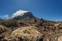 In de heldere, hoogstaande zon van het Teide Nationaal Park ligt de uitgestrekte Caldera de las Cañadas als een oud, open boek van steen. Tussen afbrokkelende lavavelden en gekartelde rotsen verschijnt de Montaña Guajara - stil maar machtig - met haar top gehuld in de delicate sluier van passaatwindwolken die zachtjes over haar flanken strijken, alsof ze de berg tot rust wil brengen of haar verhalen wil bewaren.