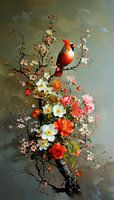 Dit schilderij toont een prachtig tafereel van een felgekleurde rode kardinaal, zittend op een tak te midden van een weelderige bloemenpracht. De bloemen zijn gedetailleerd en variëren in kleur van zachte roze en witte tinten tot levendige oranje en gele schakeringen. De fijne takken waarop de kardinaal zit, zijn bezaaid met delicate bloesems en knoppen, wat een gevoel van vroege lente oproept. De achtergrond is subtiel en neutraal gehouden, waardoor de kleuren van de vogel en de bloemen nog meer opvallen. Het geheel straalt een serene en harmonieuze sfeer uit, met een vleugje romantiek en natuurlijke schoonheid.