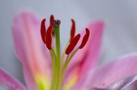 De verlichting komt hier van onder af waardoor de fijne strucktuur van zowel meelddraden als stamper benadrukt worden. De bloemblaadjes zelf fungeren slechts als achtergrond.