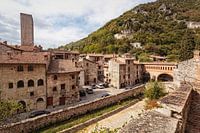 Stadsgezicht van Gubbio met afwatering kanaal (Umbrië, Italië)