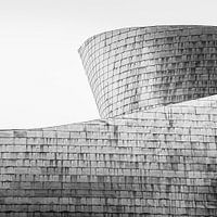 Een vierkante 1:1 Zwart-Wit foto met close-up details van het beroemde Guggenheim Museum in de Spaanse stad Bilbao met zijn aparte vormen en zilver en goudkleurige glimmende buitenkant tijdens een zonsondergang op een zomeravond.