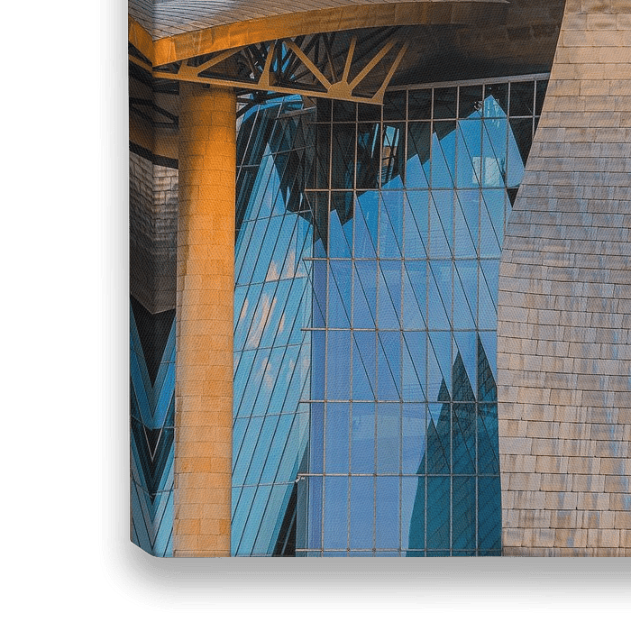Een verticale foto met close-up details van het beroemde Guggenheim Museum in de Spaanse stad Bilbao met zijn aparte vormen en zilver en goudkleurige glimmende buitenkant tijdens een zonsondergang op een zomeravond.