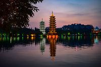Avondlijke weerspiegeling van twee verlichte pagodes in een meer in het centrum van de Zuid-Chinese stad Guilin.