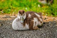Een jong nijlgansje, aangetroffen op nat asfalt in een park in Den Haag. In het gezelschap van zijn of haar ouders, broertjes en zusjes trouwens maar die zijn net buiten beeld.