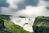 Gullfoss waterval in IJsland landschapsbeeld met nevel die oprijst van de waterval met een lange belichting tijdens een stormachtige dag in de zomer. De Gullfoss waterval en stroomversnellingen is een van de belangrijkste attracties van de Golden Circle Tour in Zuid-IJsland.
