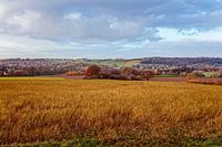 Panorama van de Dolsberg bij het gehucht Beertsenhoven en het dorp Gulpen (linkerzijde) in het Zuid-Limburgse Heuvelland.