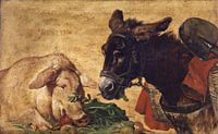 Een varken is druk en gulzig aan het eten samen met een bepakte ezel, een lastdier.
