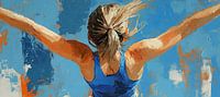 Gymnastiek | Vrouw met gespreide armen - Op dit gymnastiek schilderij zie je een vrouw met gespreide armen, die het gevoel van vrijheid en beweging uitstraalt tegen een heldere blauwe achtergrond met aanvallen van andere kleuren.